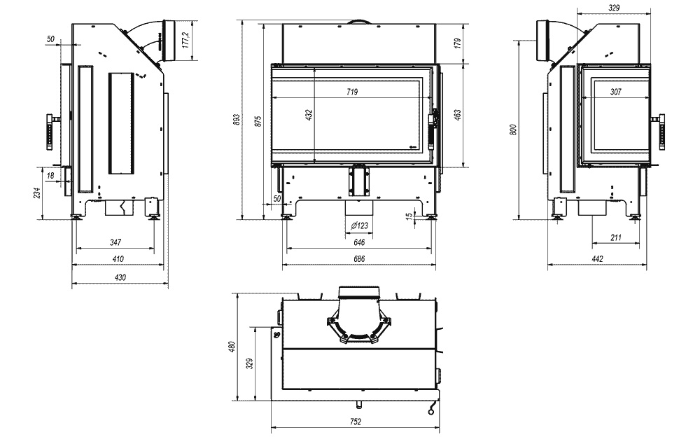 Stabilita a flexibilita inštalácie – Nastaviteľné nožičky a otočný výstup dymovodu prispôsobia zariadenie každému interiéru.