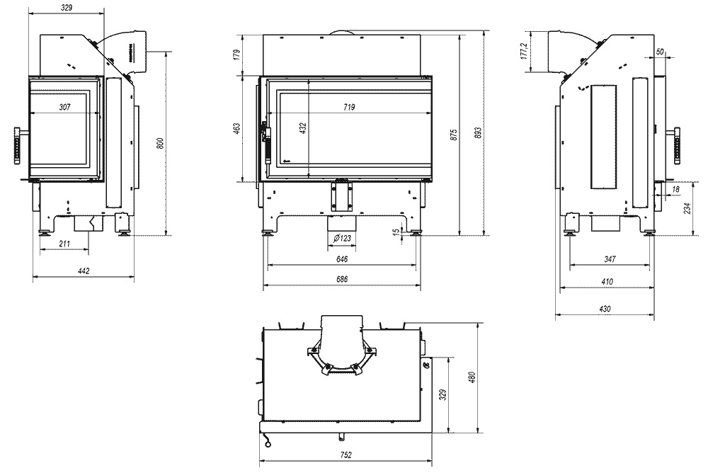 Stabilita a flexibilita inštalácie – Nastaviteľné nožičky a otočný výstup dymovodu prispôsobia zariadenie každému interiéru.