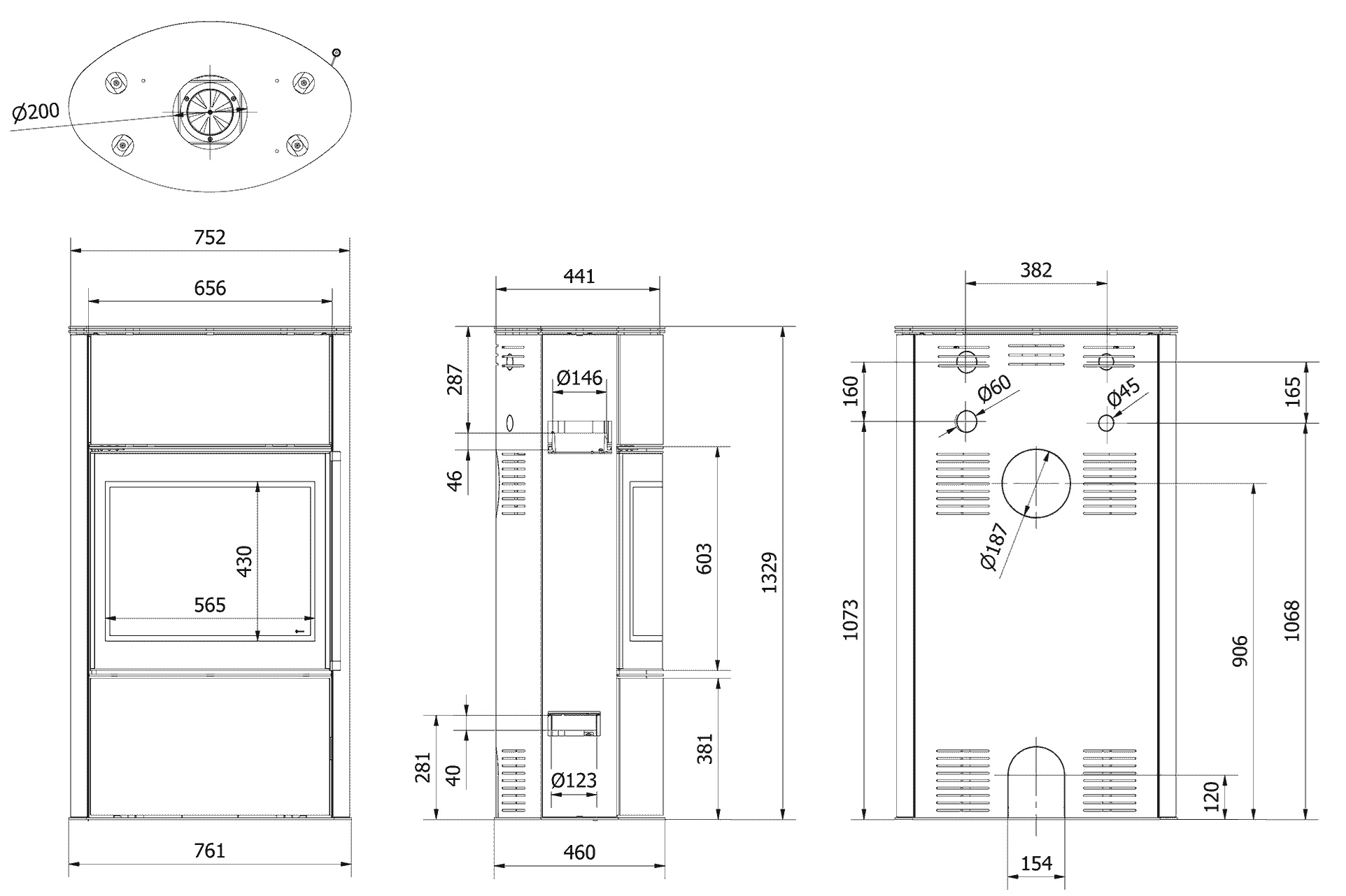 - jednoduchšia inštalácia kachlí vďaka otvoru v základni - Ø200 mm,