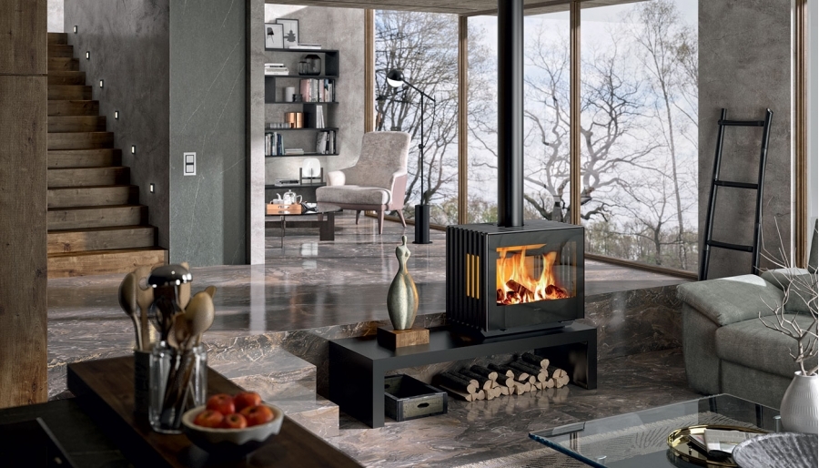 Pohľad na blikajúce plamene si môžete vychutnať z každej strany miestnosti - kachle sú na bočných stranách presklené. Záujme aj liatinová rebrovaná konštrukcia, ktorá robí kachle výnimočnými a nemali by chýbať v žiadnej súčasnej domácnosti.